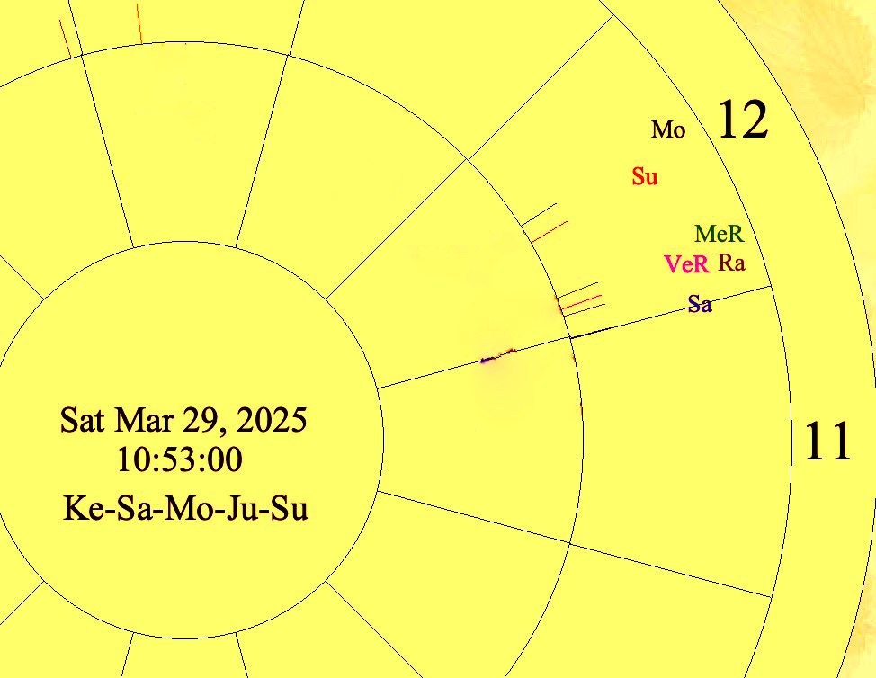At the apex of the transit on March 29, there is also a partial solar eclipse. So Sober Saturn will be dilly-dallying in the sandhi while the light of the sun will be partially blotted out. Blergh.